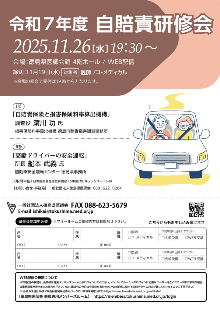 令和7年11月26日、徳島県医師会4Fホールにて自賠責研修会が開催されます。