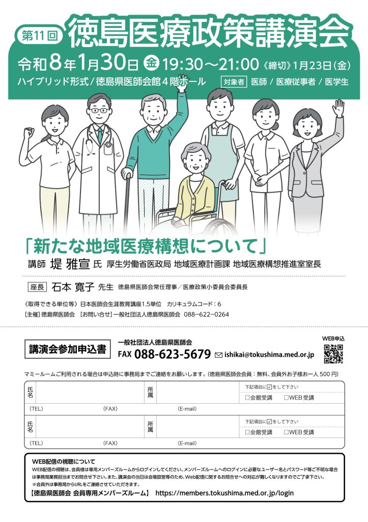 令和8年1月30日、徳島県医師会4Fホールにて徳島医療政策講演会が開催されます。