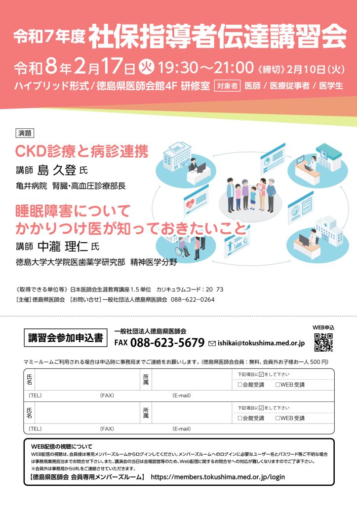 令和8年2月17日、徳島県医師会4Fホールにて社保指導者伝達講習会が開催されます。